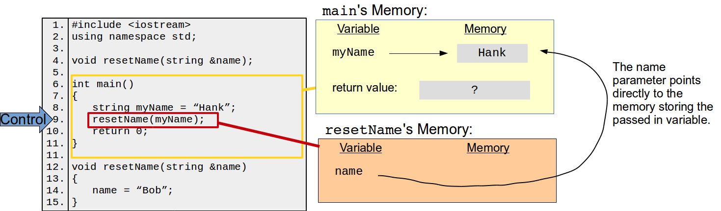 Here is the memory diagram for an adaptation of the program above. This only shows the step when the resetName function is invoked and memory is created for the function instance. We can see that the function's name parameter is directly linked to the value of the variable that was passed in (i.g., myName).