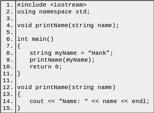 The printName function is invoked. When this happens, new memory is created for the function and an entry is made for every parameter and variable declared within the function. The function does not return anything, so we do not need to worry about keeping track of a return value. The values of any variables or literal values passed in a parameters to a function during invocation are then copied to the memory reserved for those parameters in the function's memory space. In this case, the variable myName in main was passed as a parameter. Therefore, we take the value of that variable, "Hank", and then copy that value to the space for the corresponding parameter in the function signature, which is name.
