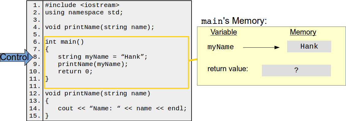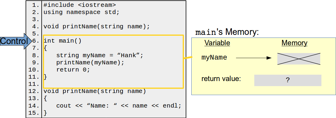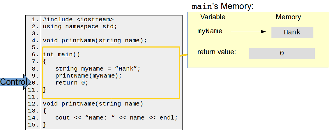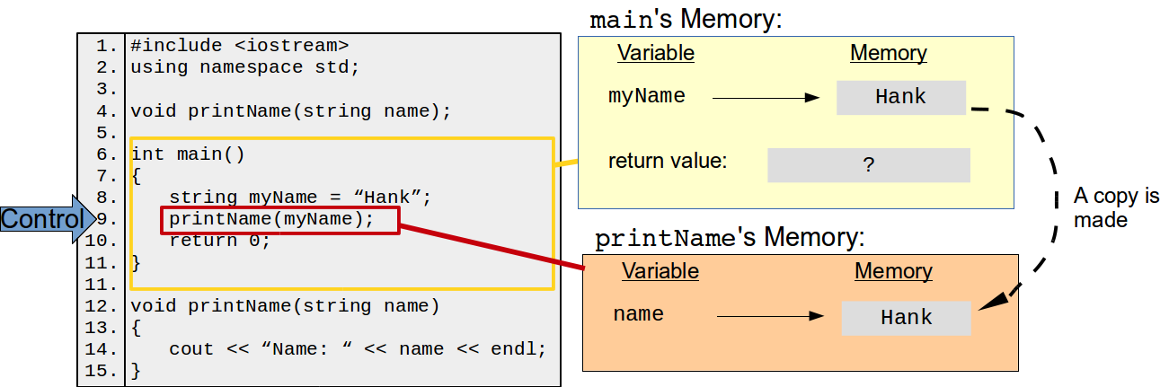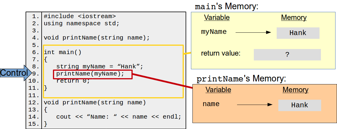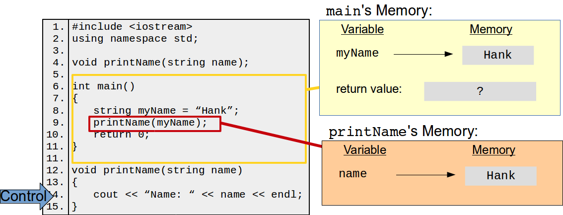 It's crucial to understand what happens when you invoke a function in terms of memory. The function in which an invocation is made, e.g., main in the example above, is called the caller. New memory is allocated for the function to do its thing. This new memory include space for all of the parameters and variables declared within the function. The values passed from the caller to the function are copied over to this memory, and are stored under the parameter names. The program control is then handed over to the functions and the function executes. Once the function has finished or returns a value, program control is given back to the caller, along with the return value if anything is returned. Once the function has returned control, it and all of its variables (including the parameters) are removed from memory. One consequence of this is that function instances are complete independent of each other—if I invoke printName multiple times, each invocation has no knowledge or shared variables with any of the other invocations.