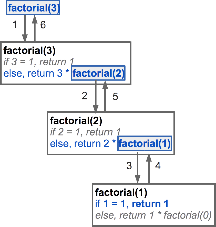 Let's consider what happens if we call factorial(3). In this first invocation, we check the base case. Since 3 ≠ 1, we continue to the recursive case. Here's we want to return the product of 3 and factorial(2). Before the multiplication or return can occur, we must first invoke factorial and wait it to return. So our current invocation is just hanging out until it hears back from factorial(2). I this second invocation, factorial(2), we check the base case, which isn't met as 2 ≠ 1. So we go to the recursive case and return the product of 2 and factorial(1). As before, we can't perform the multiplication or the return until factorial(1) has returned, so now our second invocation is also just sitting around waiting. In the third invocation, factorial(1), we check the base case, and this time, the criteria are met: 1 = 1 (woohoo!). So that means we return 1. Good. This causes control to go back to the second invocation, which can now multiple 2 × 1 and return 2. This return gives control back to our first invocation, where we need to multiple 3 × 2 and return 6. That returns control to wherever we originally invoked factorial(3), and we have our answer: 6. \ref shows a visualization of the invocations.
