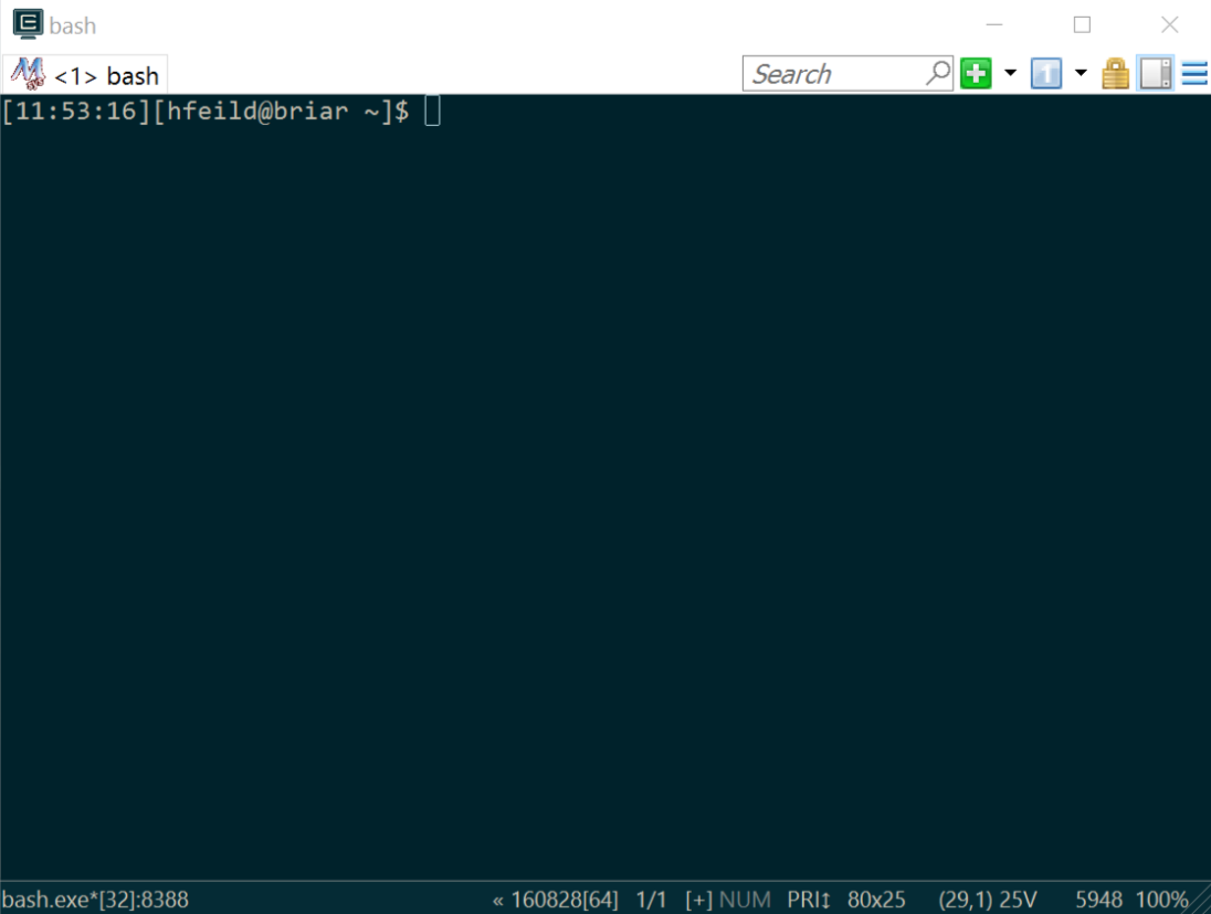 If you have not already installed ConEmu, please follow these directions to do so. Once installed, open ConEmu, which should bring up something that looks like: