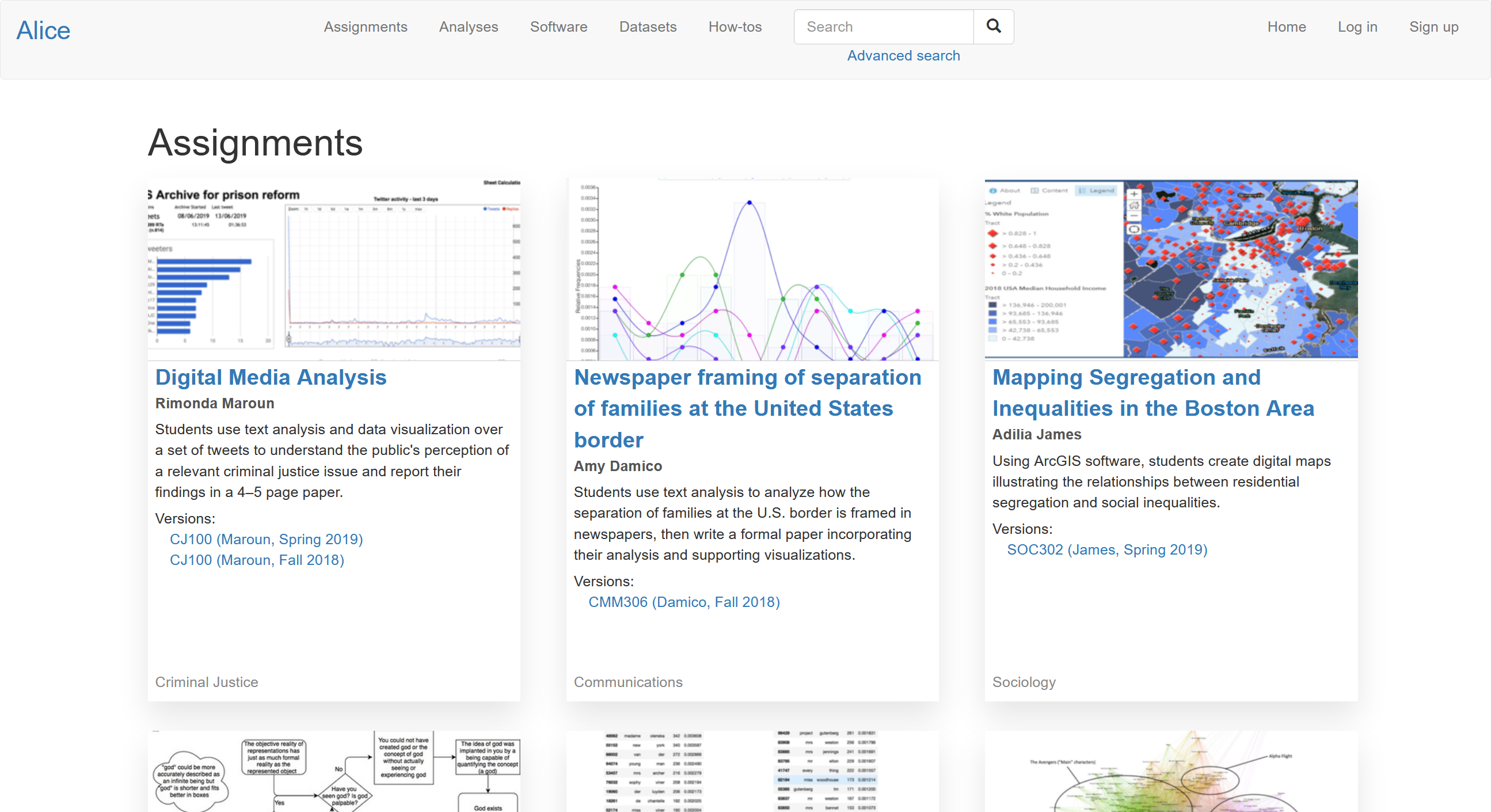 Spring 2017–presentAlice is a website built with Ruby-on-Rails for tracking datasets, anlayses, software that supports those analyses, and assignments that use all three. It was created as part of a two-year Davis Foundation grant awarded to Endicott College in 2016 and carried out between summer 2017 and spring 2019.
