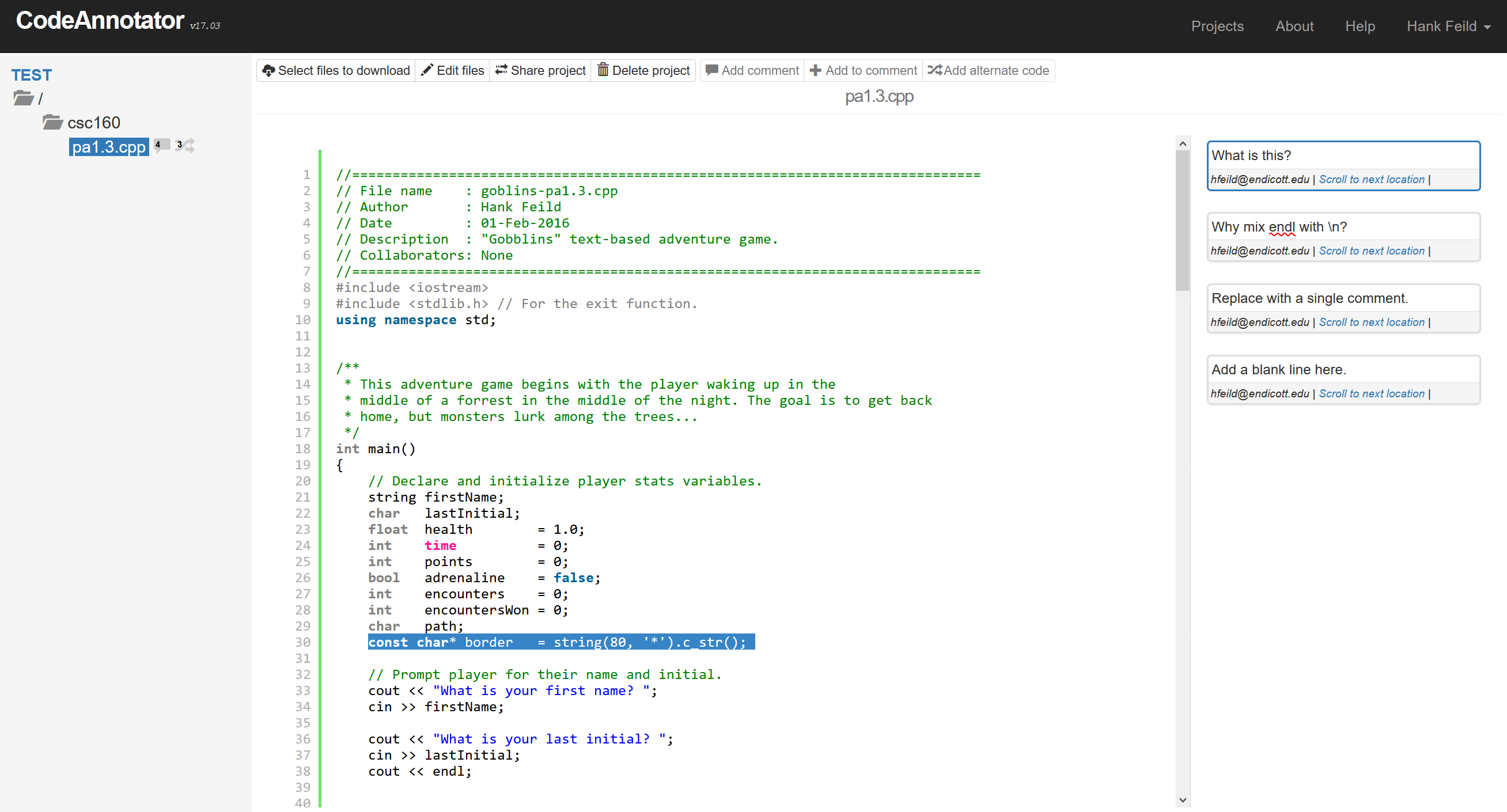 Spring 2015–presentCodeAnnotator is a web application that was motivated by my need to provide feedback to students on code in a digital format. It began as a class project in the first run of CSC270 Software Engineering in 2015. Built with Ruby on Rails, CodeAnnotator allows users to upload code organized in projects, mark up that code by adding comments and alternative code snippets, and share projects with other users (for viewing, annotating, or managing) or publically (view only). I've used CodeAnnotator in at least one class most semesters since creating it. The nice thing with the public sharing is that I can share links with students without requiring them to sign up