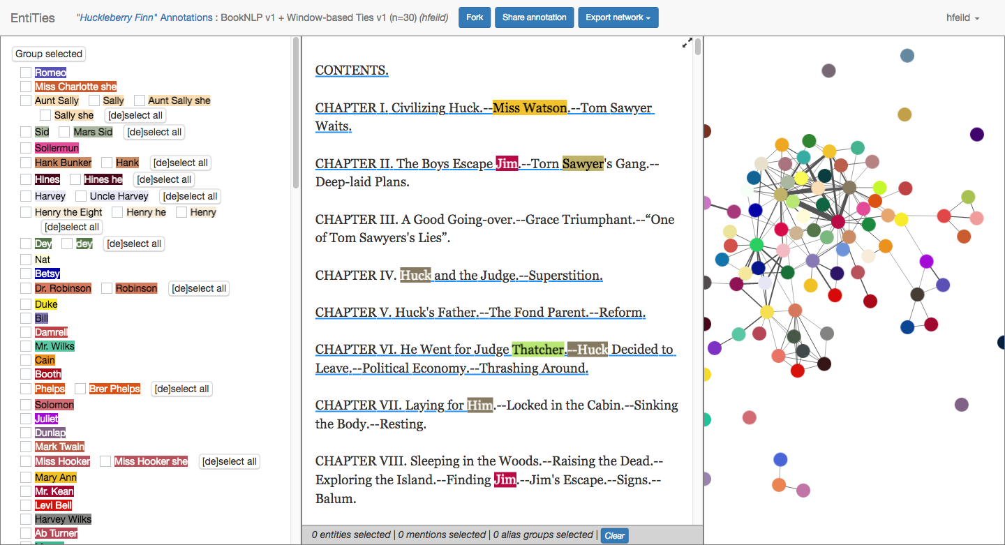 Spring 2018–presentEntiTies is a web application that allows a user extract entity networks from a text file (e.g., character networks from a novel) using one or more workflows: manual, semi-automated, or fully automated annotation. In the manual workflow, the user annotates entity mentions throughout the text and ties (relationships) between them (such as when the entities speak to one another or interact). In the fully automated workflow, the user chooses from a list of algorithms to automatically identify entities and their mentions throughout the text and the relationships between them. In the semi-automated workflow, users run the fully automated algorithm, and then correct the annotations. Other features of EntiTies include: a study interface built in to assist with user studies and dataset creation; the ability to fork annotations; private and public sharing of texts and specific annotations of a text.